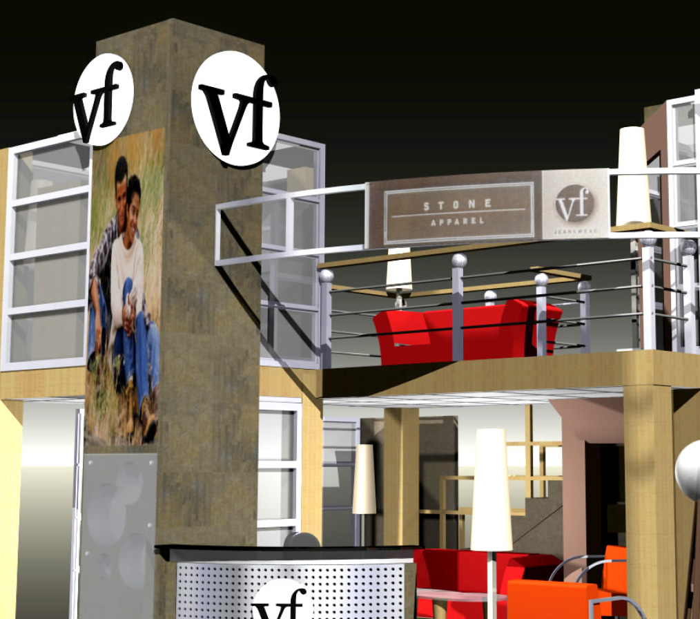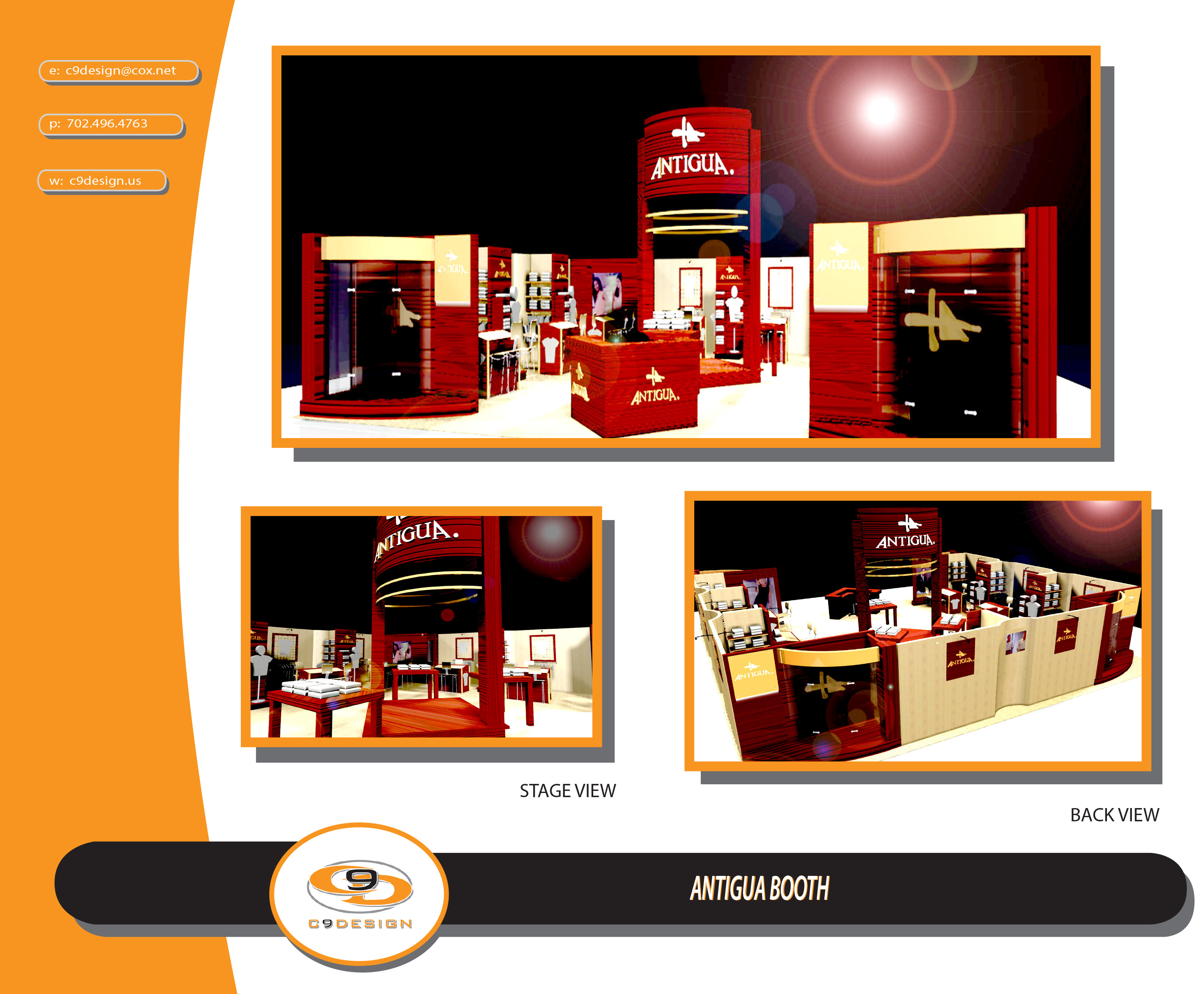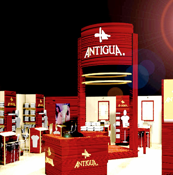 Large booth design for Antigua to display latest lines of clothing. The booth includes a presentation stage underneath the overhead signage, display cases at each exterior corner and eight, individual display stations for separate vendors.