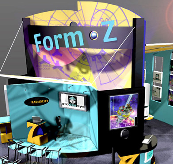 Concept booth for the 3D-modeling software company, Form Z. Booth features include a swing awning covering the presentation stage, a pass through display gallery with kiosks demonstrating the software capabilities and custom, logo-driven, reception and presentation desks.