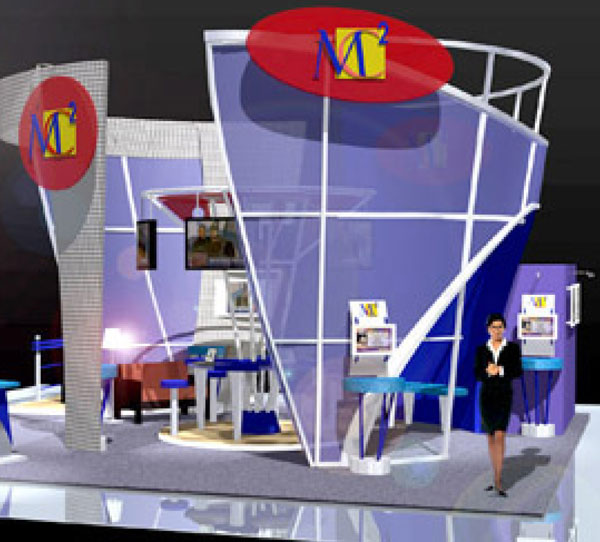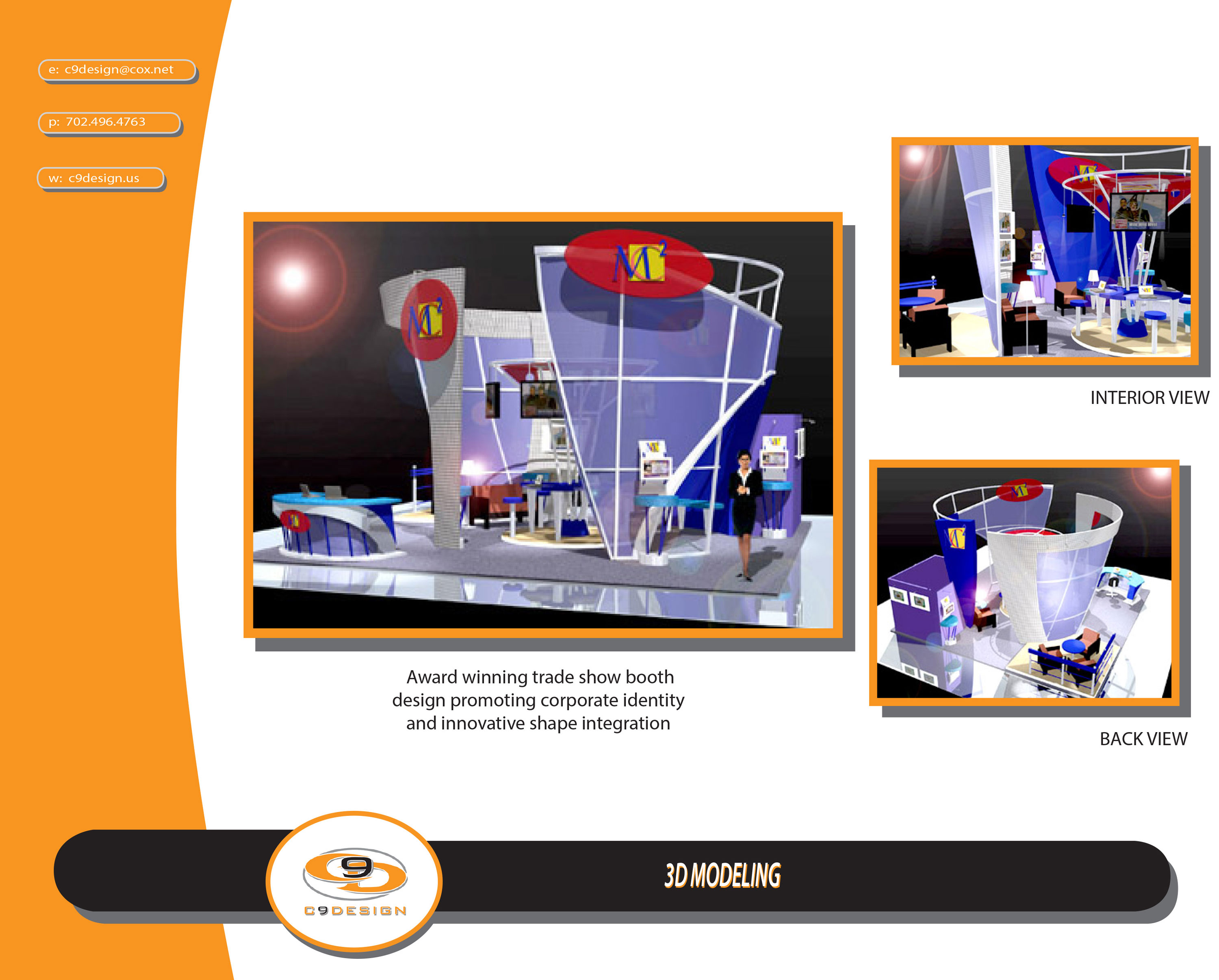 Conceptual booth design and winner of internal, company-wide, contest for best new booth design. This booth includes innovative shape design with circular, structural skeleton, tapering to a smaller diameter base. Portions of the walls are clad with dimpled laminates, as well as, screened with nylon for privacy and interest.