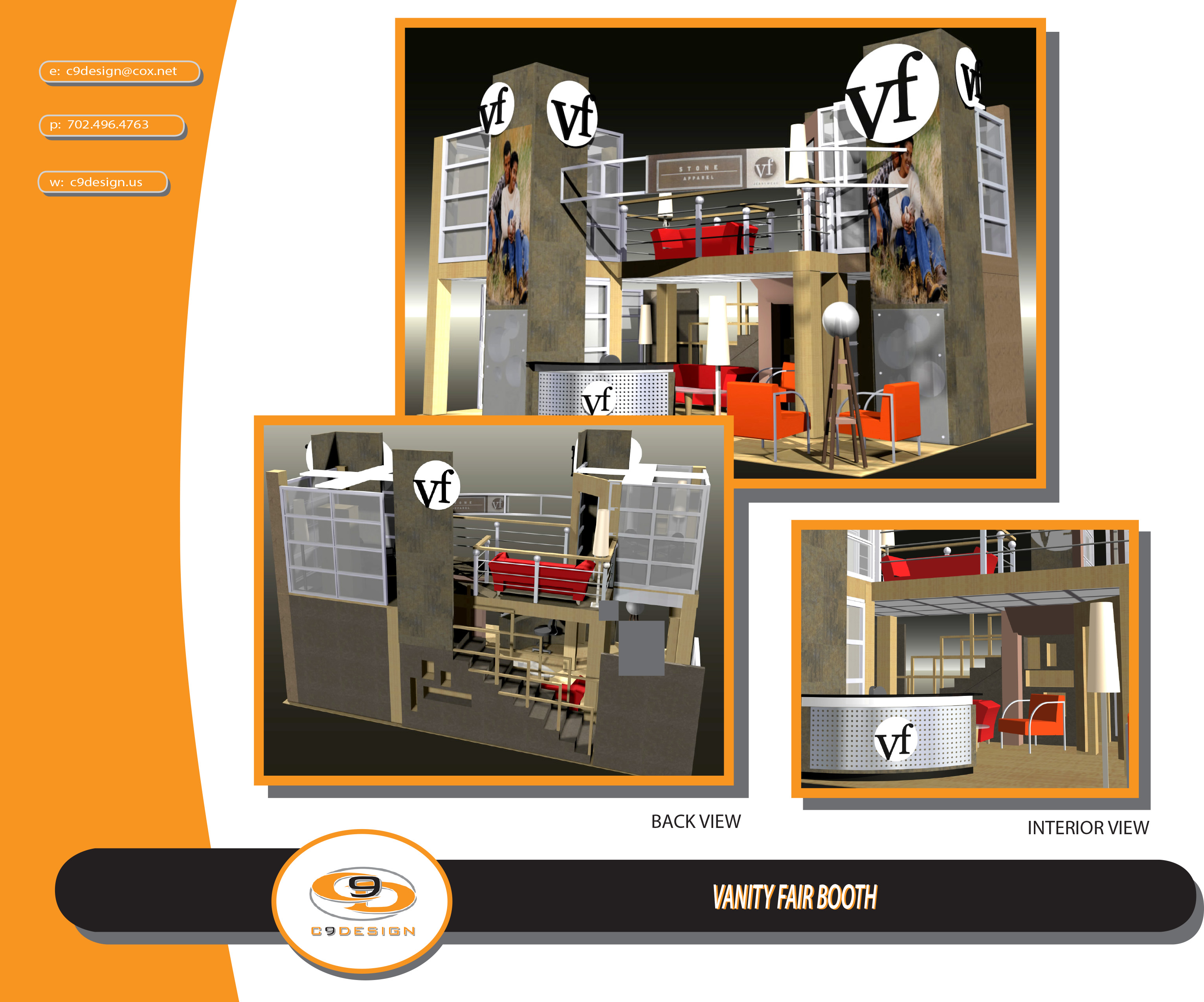 Two-story booth design for Vanity Fair incorporating large-scale graphics, two upper level conference rooms, casual lower-level relaxation lounge and a custom reception desk design.